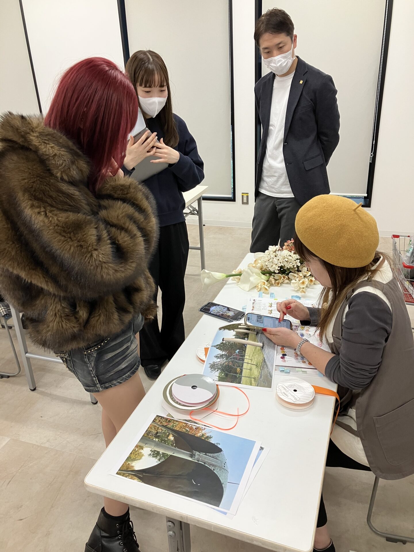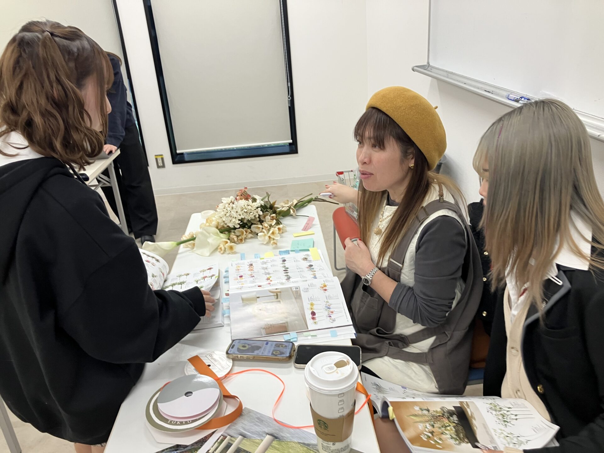 教室での花の勉強と、現地での会場づくりにも余念がありません。